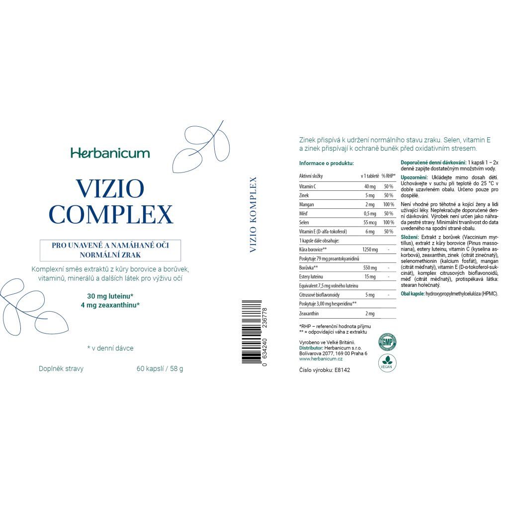 | Aktivní látky: | Vitamin C, Zinek, Borůvky, Lutein, Zeaxanthin, Vitamin E, Mangan, Selen, Hesperidin, Kůra borovice |