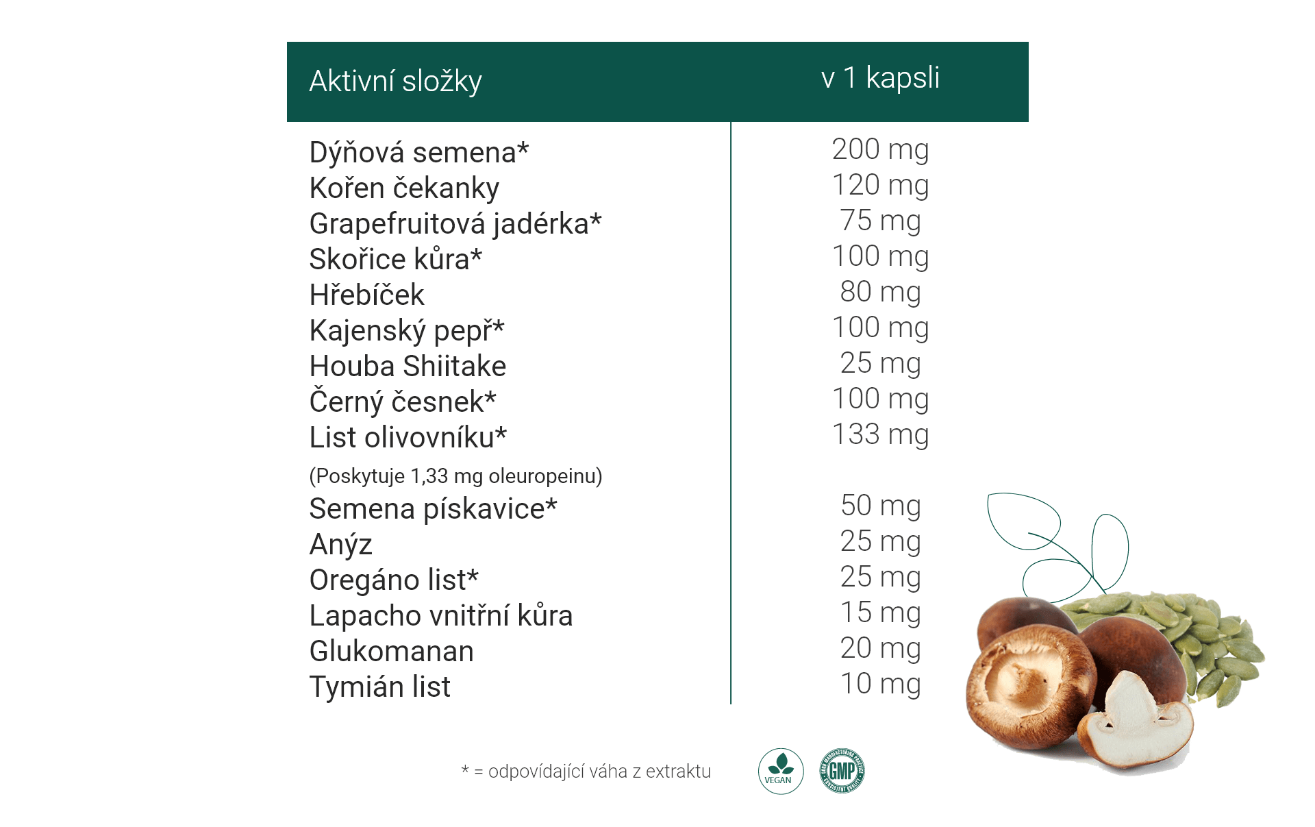 | Aktivní látky: | Česnek, Skořicovník cejlonský, Oregáno, Jádra grapefruitu, Glukomannan, Kajenský pepř, Shiitake, Čekanka, Skořice, Hřebíček, Tymián, Lapacho, Anýz, Dýňová semena, Pískavice, Oleuropein, List olivovníku |