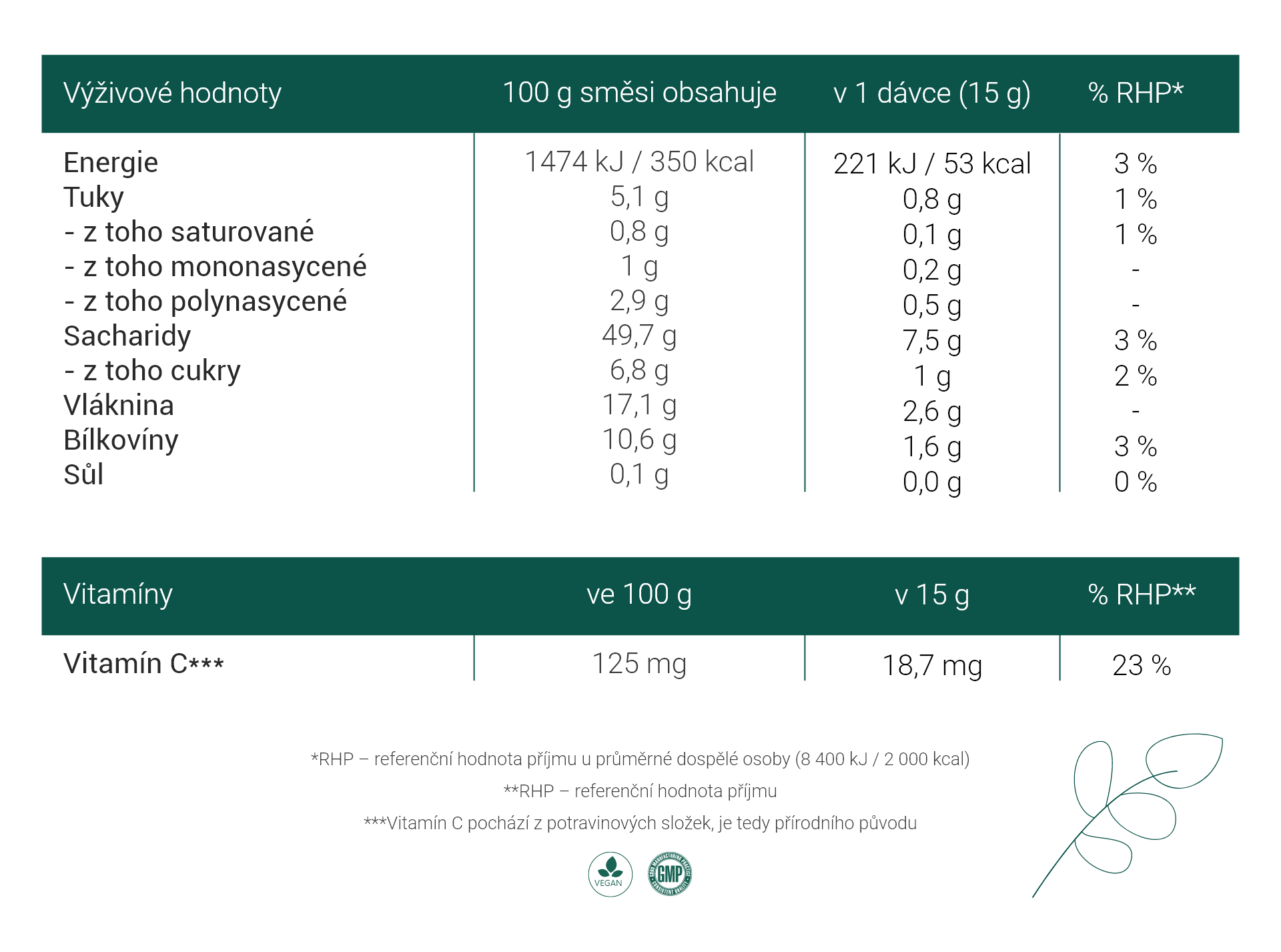 - Každá dávka obsahuje 23 % doporučené denní dávky vitamínu C získaného z potravin